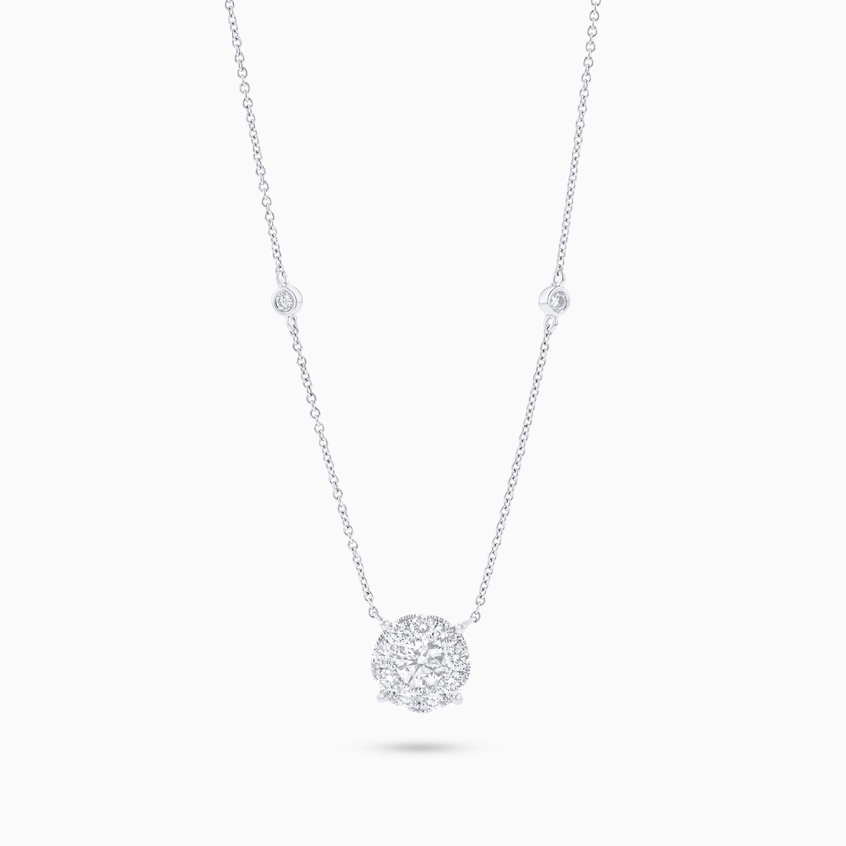 The Seamless Raisa Necklace is a beautifully crafted piece that exudes elegance and timeless sophistication. Made in luxurious 18k white gold, this necklace features a seamless, delicate chain adorned with sparkling natural diamonds. The pendant showcases a stunning round cluster of diamonds with a combination of prong and channel settings, creating a harmonious and secure design that highlights the brilliance of each stone. With a total diamond weight of 0.77 carats—G-H in color and VS-2 clarity—the necklace radiates sophisticated sparkle from every angle. The length of 16.5 inches makes it a versatile piece that complements both casual and formal looks. Customizable in platinum, 18k rose gold, or 18k yellow gold, this necklace adds a luminous, celestial touch to any jewelry collection, perfect for elevating your everyday style or special occasions.