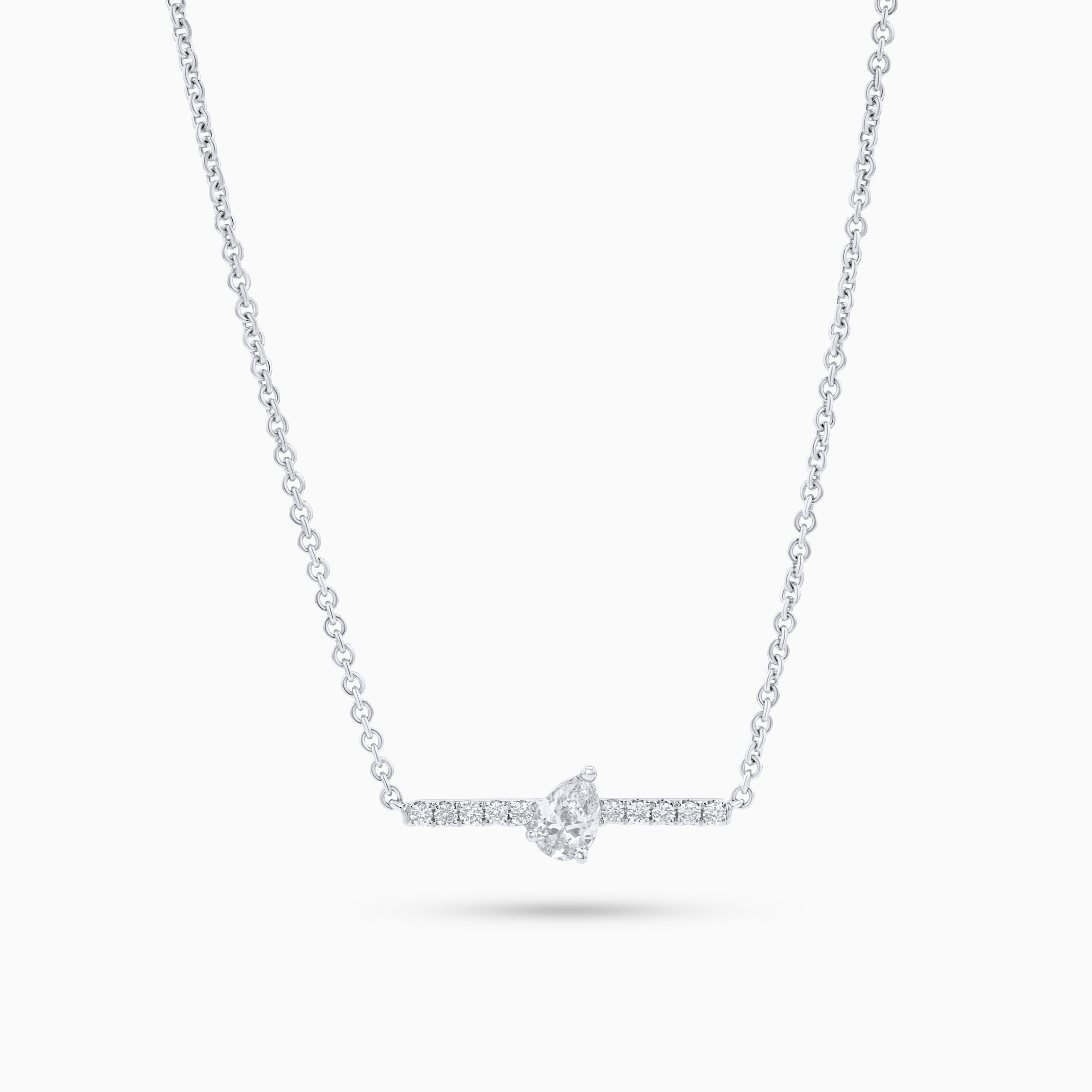 Our Seamless Serephina necklace features a unique design with a row of dazzling diamonds and a lovely pear-shaped diamond at its heart, set slightly askew for a touch of asymmetrical allure.